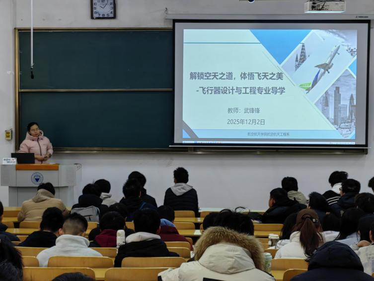 航空航天工程系主任武锋锋副教授聚焦飞行器设计与工程专业的人才培养路径,阐述了“修一等品行、求一等学问、创一等事业、成一等人才”为核心的育人理念,对专业培养方案进行了详细解读。她引用屠基达院士的例子,鼓励同学们要秉持严谨的工程执着和敬业的科研热忱,将热爱融入扎实的求学过程中。