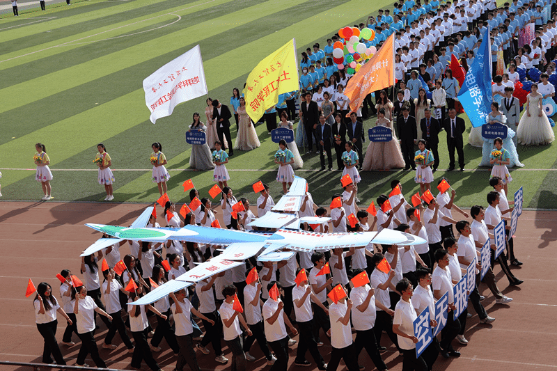 航空航天学院方阵以一抹炽烈的“中国红”点燃全场。晴空之下,一面面五星红旗迎风招展,与同学们手擎的飞机模型交相辉映,汇成一道流动的青春风景线,将航空航天人的报国赤忱与春日生机完美交融。“逐梦空天,使命在肩”是他们的理想追求;“强国有我,青春向前”是他们的铿锵誓言。他们以昂扬的姿态,在赛道上书写着属于太原理工航院人的热血与担当。